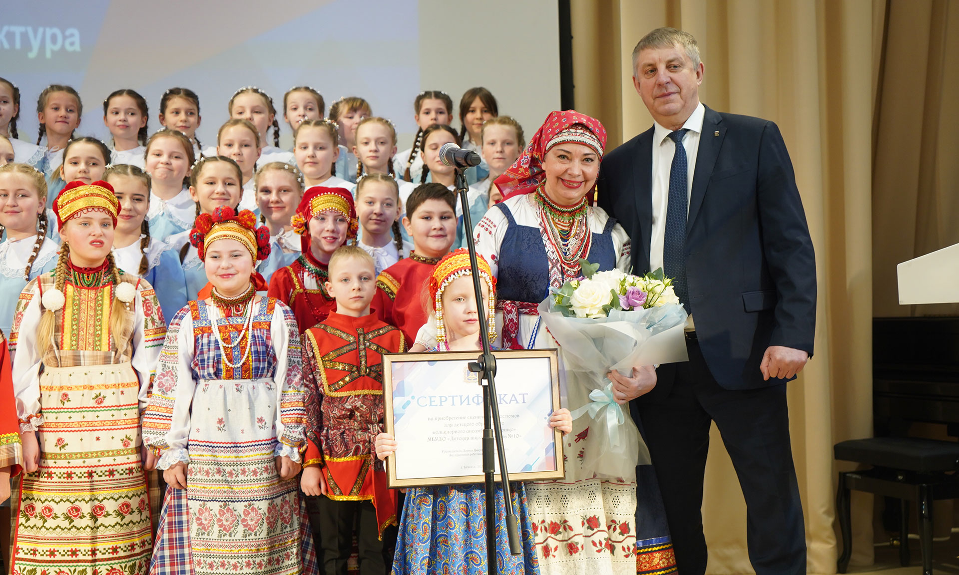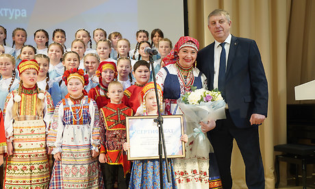 Глава региона вручил детскому фольклорному ансамблю «Лукошко» (руководитель — заслуженный работник культуры РФ Лариса Тимошенко) сертификат на приобретение концертных костюмов.