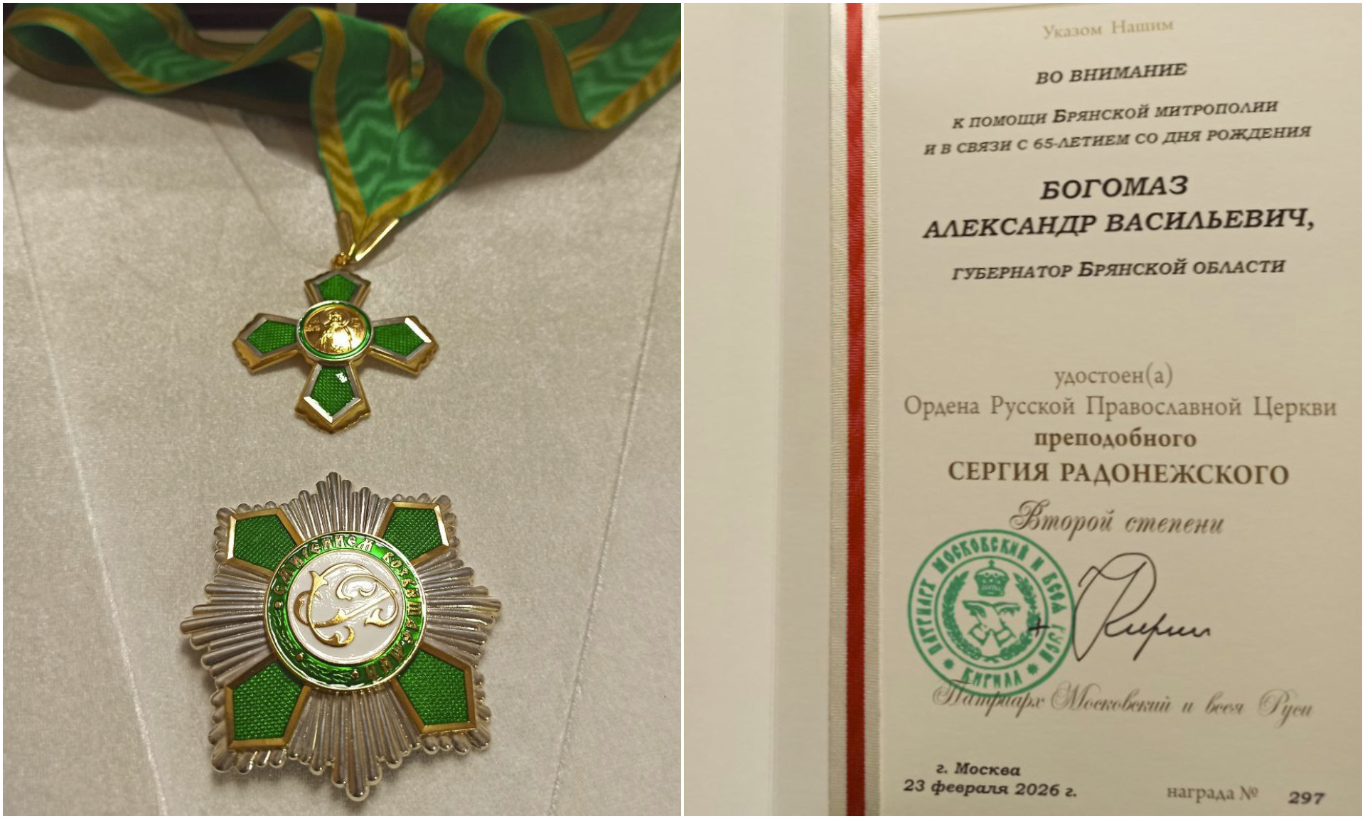 Патриарх Московский и Всея Руси Кирилл наградил Губернатора Брянской области Александра Богомаза орденом преподобного Сергия Радонежского II степени
